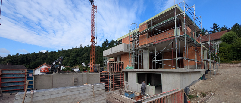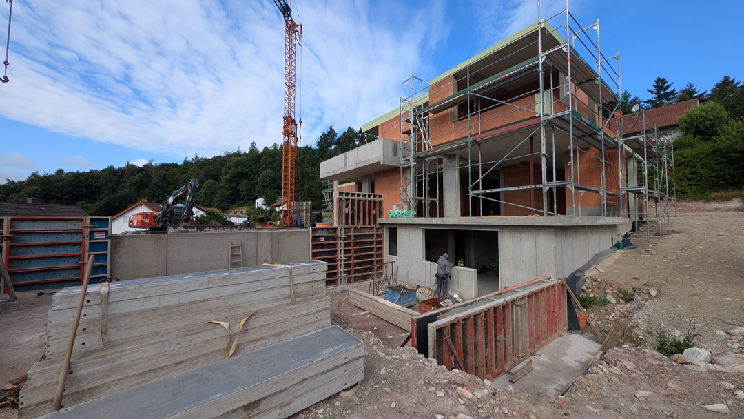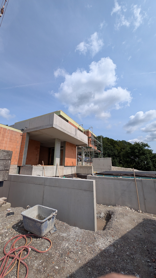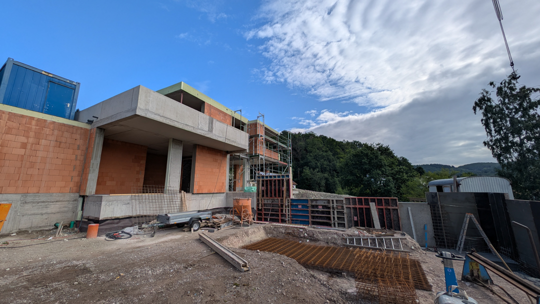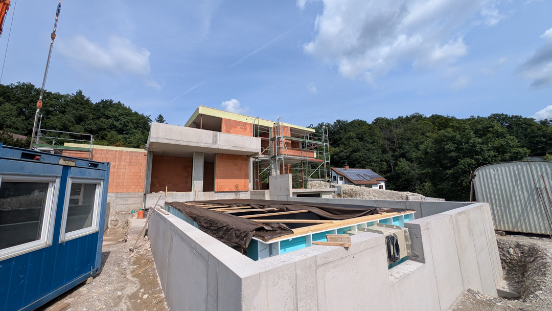 Bei diesem Projekt an der Bergstraße sind die Rohbauarbeiten bereits weit fortgeschritten.Auch die Poolarbeiten haben begonnen.