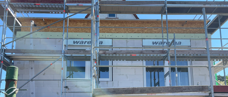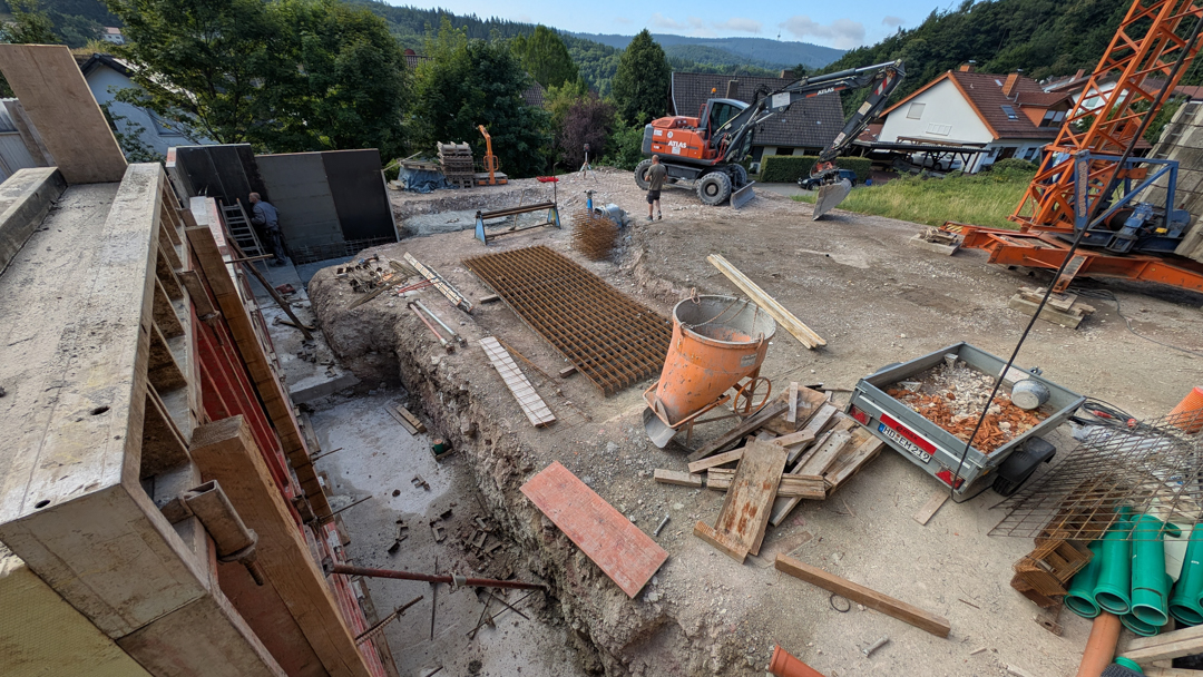 Nach Herstellung der Baugrube ist nun der Rohbau im Gang.Die Außenwände des Kellergeschosses sind fertig betoniert, die Innenwände werden in Kalksandsein ausgeführt.