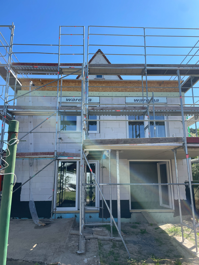 Es entsteht ein großzügiges Haus in wunderbarer Bergstraßen-Lage. Zur Zeit werden die Wände des EG gemauert.