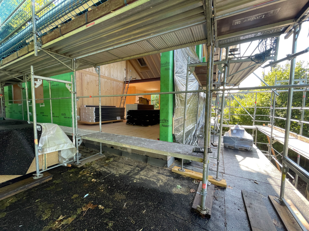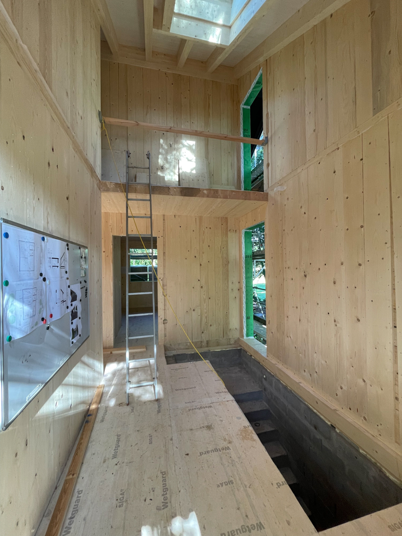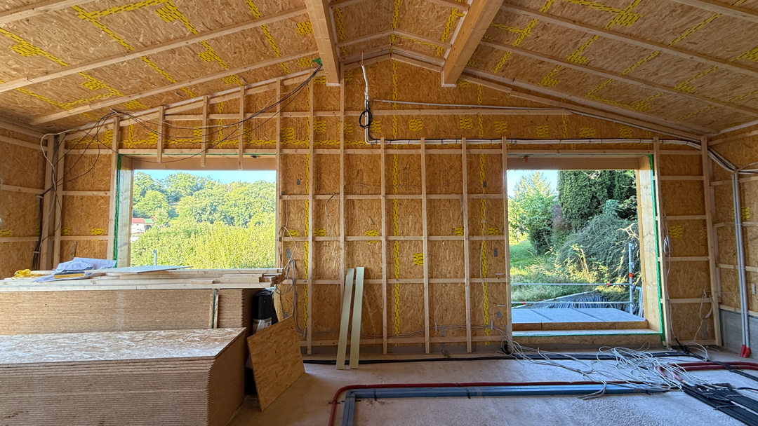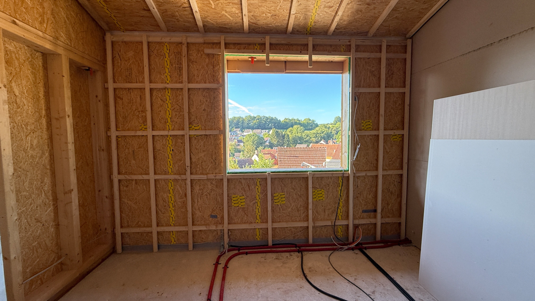 Dieses unterkellerte Haus in Holzständerbauweise entsteht im Odenwald.Auf den Bildern ist zu sehen, dass gerade die Installationen eingebaut wurden.