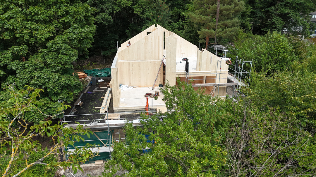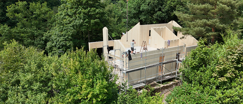 Auf den Bestandssockel dieses Hauses im Odenwald werden in Massivholzbauweise zwei Stockwerke mit Satteldach gestellt.
